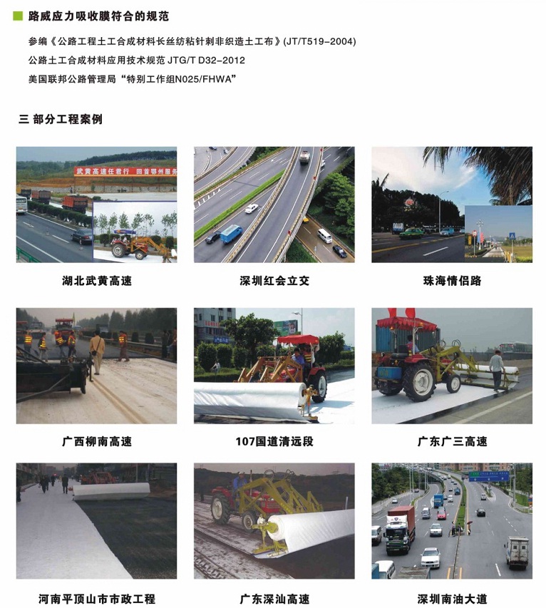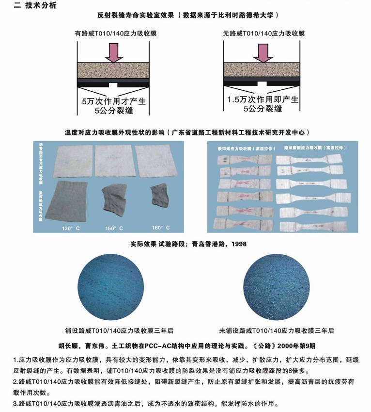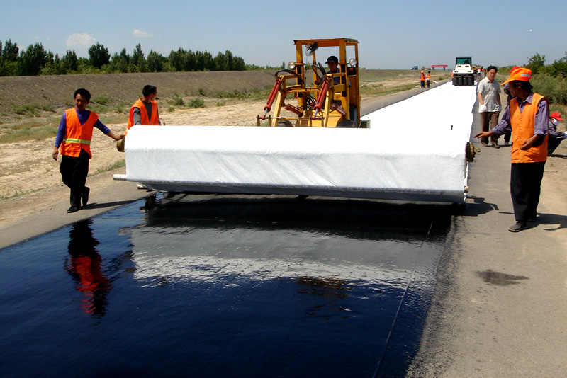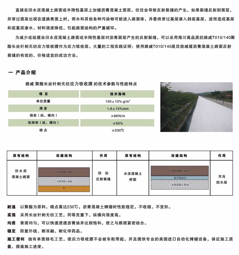耐溫:以聚酯為原料,熔點(diǎn)高達(dá)230攝氏度,瀝青混凝土攤鋪時(shí)性能穩(wěn)定,不收縮,不變形;