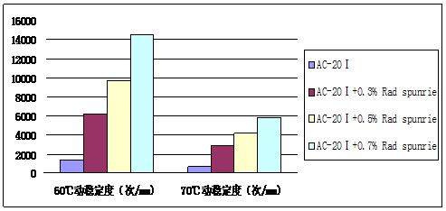 ?????? 通過圖表可以看出,摻加Rad spunrie復(fù)合高聚合物改性劑后,瀝青混凝土的抗車轍性能顯著提高。60℃、0.7Mpa條件下,摻量為0.3%的動穩(wěn)定度可以達到6000次/mm以上,摻量為0.5%時可以達到9000次/mm以上。