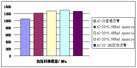 ???????瀝青混凝土的靜態(tài)回彈模量體現(xiàn)著道路的承載能力,靜態(tài)回彈模量越高,道路承載能力越強,使用壽命也就越長。按照《公路工程瀝青及瀝青混凝土試驗規(guī)程》中方法對Rad spunrie復(fù)合高聚合物改性瀝青混凝土和普通瀝青混凝土的20℃靜態(tài)回彈模量進行了對比試驗,如下表所示: