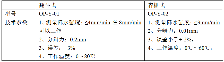 ???? 常用雨量計(jì)由容柵式、翻斗式兩種,主要技術(shù)指標(biāo)如下: