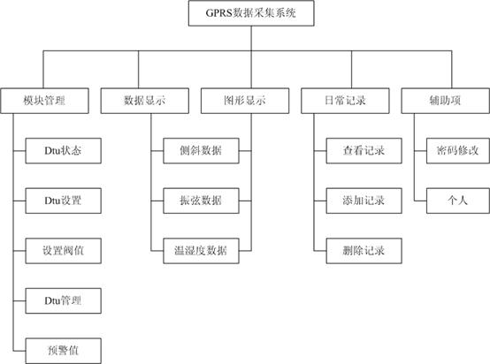 GPRS無(wú)線客戶端軟件分為如下模塊:登錄管理、模塊管理、數(shù)據(jù)顯示、圖形顯示、日常記錄、密碼修改、個(gè)人資料。功能模塊圖如下: